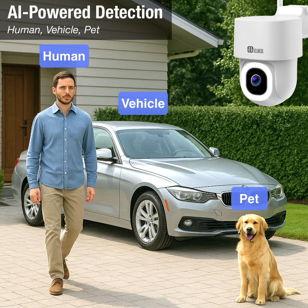 【Détection de mouvement et de son par IA】 Grâce à sa détection de forme humaine par IA, la caméra de sécurité Elder est suffisamment intelligente pour distinguer les personnes des animaux ou des objets et vous avertir en cas de mouvement ou d'approche. Cette caméra de sécurité Wi-Fi envoie également des alertes à votre application en cas de détection de son.
